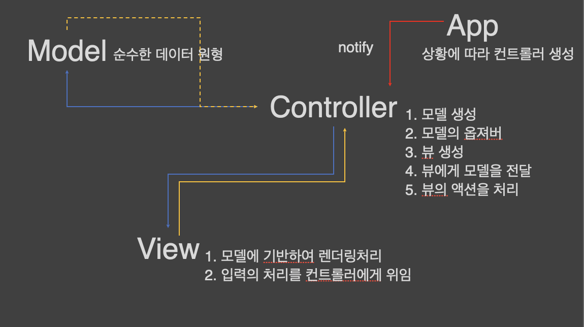 - 컨트롤러가 화면을 바꾸거나 뷰가 모델을 수신해서 뷰을 갱신하는게 의미없다.